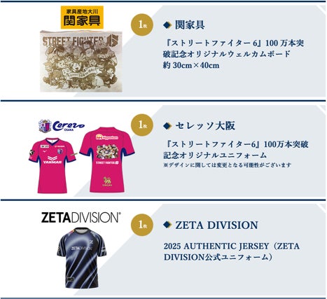 賞品には、関家具のウェルカムボード、セレッソ大阪のユニフォーム、ZETA DIVISIONの公式ユニフォームなど豪華なものが多数含まれます。