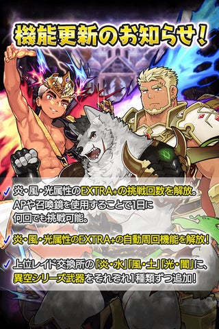 主なキャンペーン内容は、炎・風・光属性のレイドボスに挑戦しやすい「極・炎風光レイドキャンペーン」と、土属性ボス「ミョルニル」に挑戦しやすい「仗魂鍛覇応援キャンペーン」です。