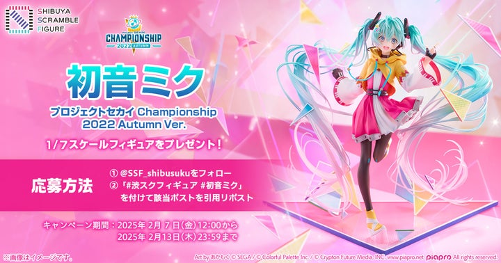 株式会社CyberZのフィギュアブランド「SHIBUYA SCRAMBLE FIGURE」より、『プロジェクトセカイ Championship 2022 Autumn』のメインビジュアルをイラストレーターあかもく氏が描き下ろした初音ミクの1/7スケールフィギュアが、2025年2月7日より予約受付開始となりました。
