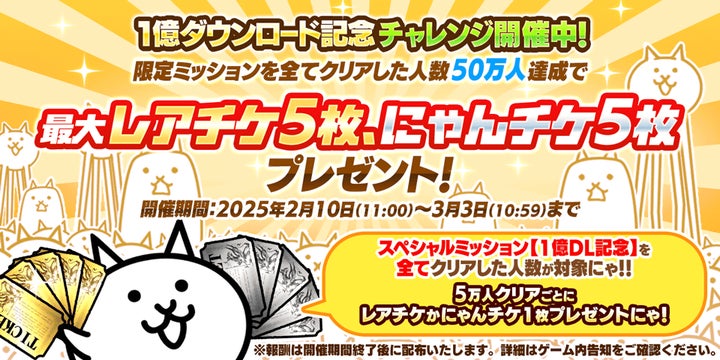 スマホゲーム『にゃんこ大戦争』がシリーズ累計1億ダウンロード突破を記念し、2025年2月10日より期間限定イベント第1弾を開催。