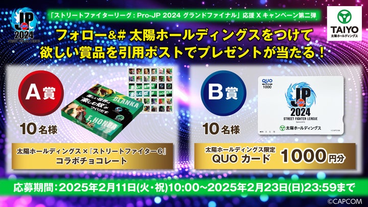 太陽ホールディングスは、『ストリートファイターリーグ: Pro-JP 2024 グランドファイナル』の応援キャンペーン第二弾として、2月11日から2月23日までXキャンペーンを実施します。