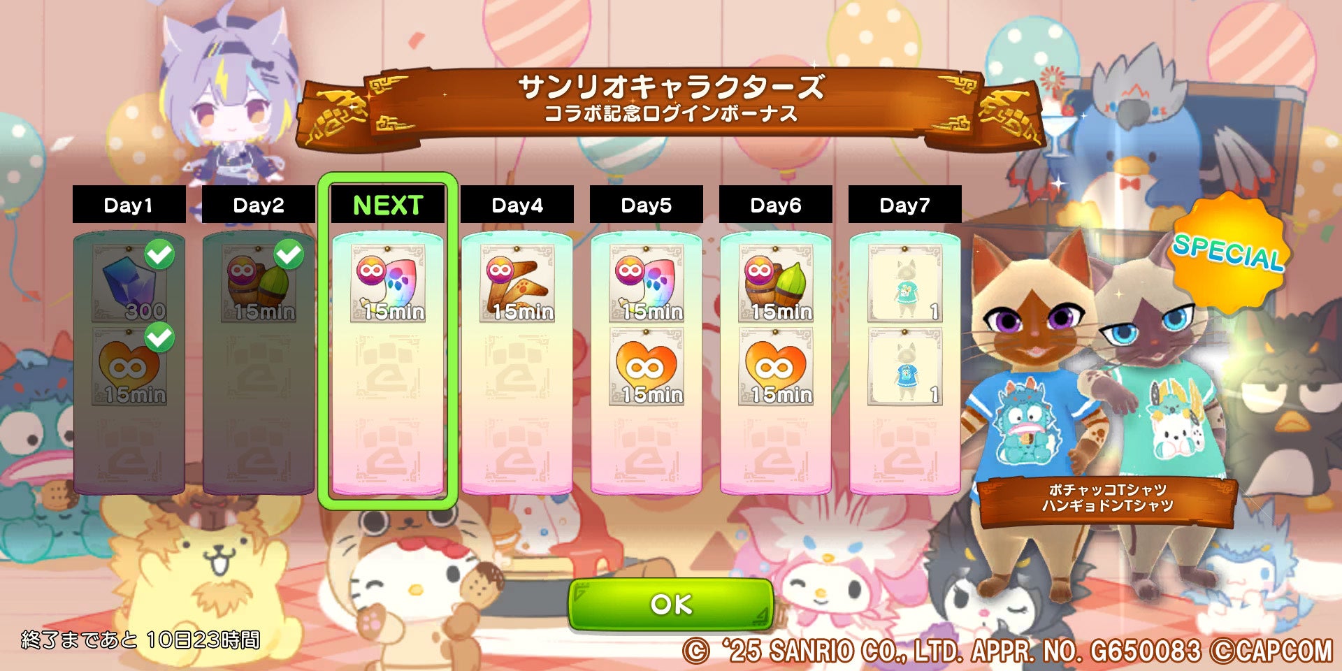 また、2月6日~2月22日にかけて2週連続でサンリオキャラクターズコラボ記念ログインボーナスとして、サンリオキャラクターとモンスターハンターのモンスターを組み合わせたデザインのTシャツ(アバター用)が配布されます。