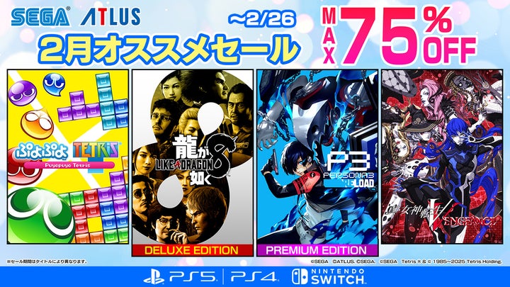株式会社セガは、PlayStation 5、PlayStation 4、Nintendo Switch向けタイトルのセール「セガ 2月オススメセール」を開催中です。