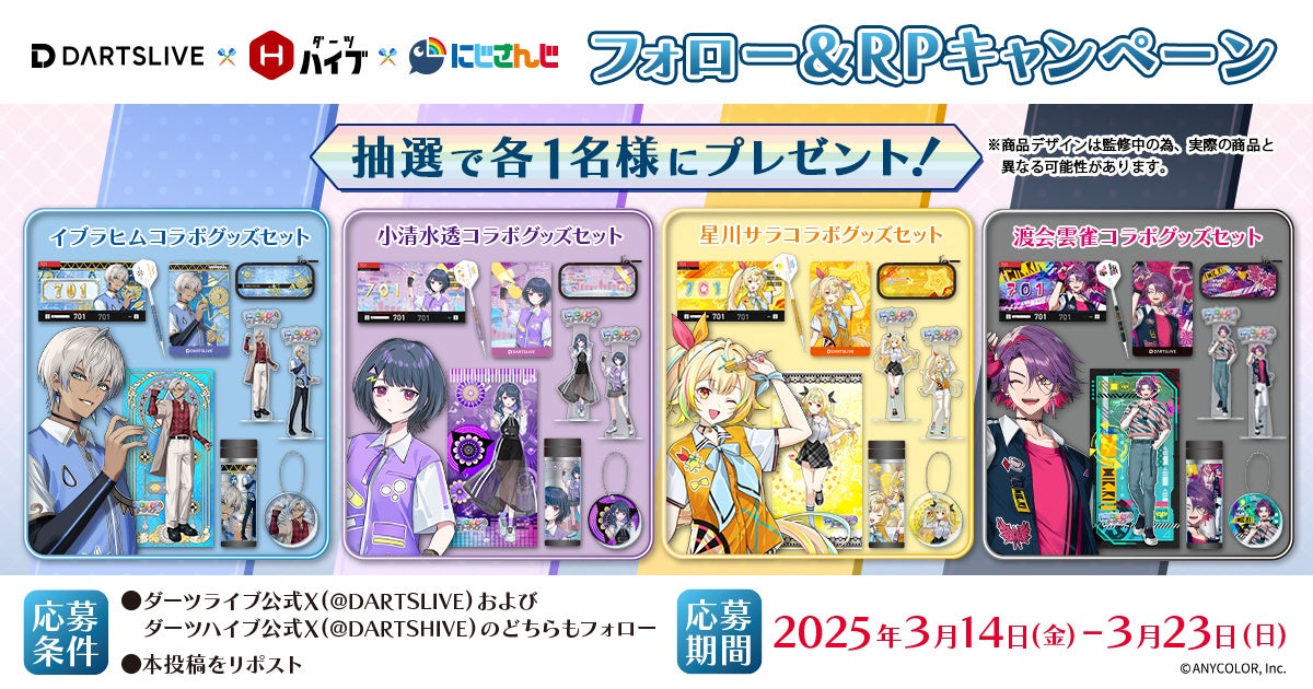 株式会社ダーツライブは、VTuberグループ『にじさんじ』所属のイブラヒム、小清水透、星川サラ、渡会雲雀の4名とのコラボキャンペーンを発表しました。