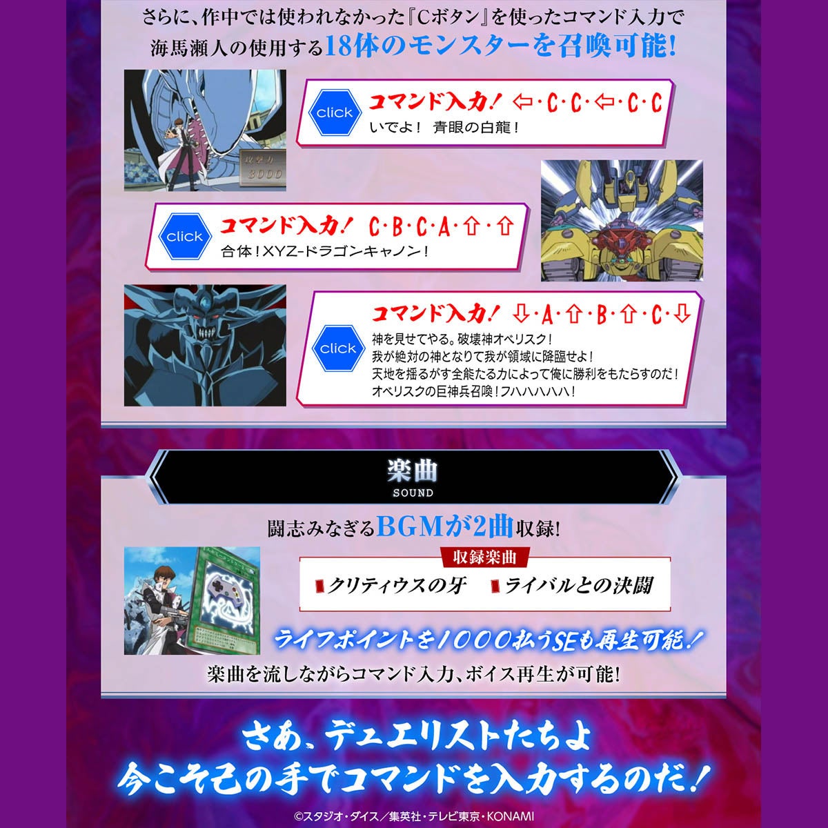 - コマンド入力で海馬瀬人のモンスターの召喚セリフや楽曲を発動可能