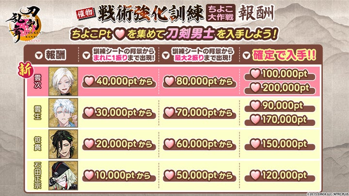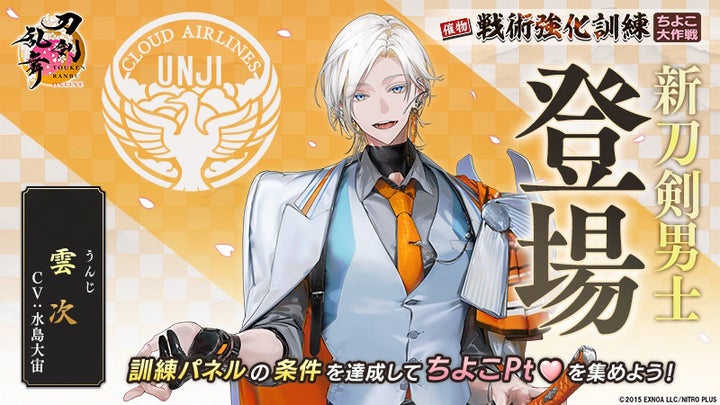 - 新刀剣男士「雲次」(cv.水島大宙)が登場するイベント「戦術強化訓練~ちよこ大作戦~」開催