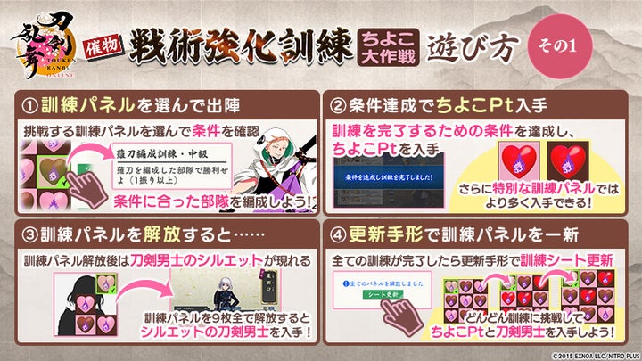 イベントでは、訓練パネルの条件を達成することで「ちよこPt」を獲得し、新刀剣男士や刀装、便利道具などの報酬と交換できます。