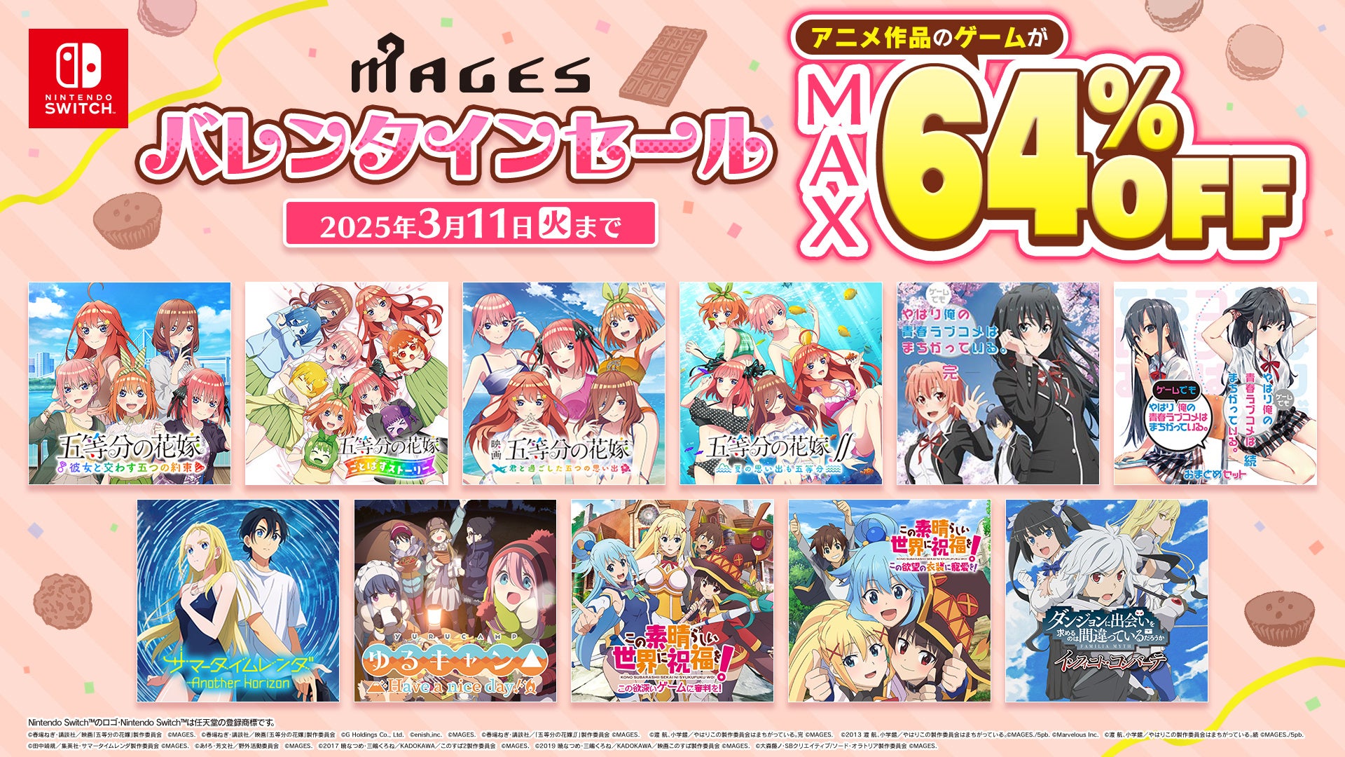 株式会社MAGES.は、2月13日(木)から3月11日(火)まで、Nintendo Switch向けダウンロード版ゲーム11タイトルを対象とした「バレンタインセール」をニンテンドーeショップで開催しています。