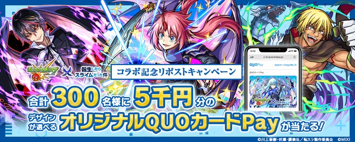 コラボを記念して、モンストキャンペーン公式Xアカウントをフォロー&リポストするキャンペーンも実施され、「オリジナルデザインQUOカードPay」が抽選で300名に当たります。