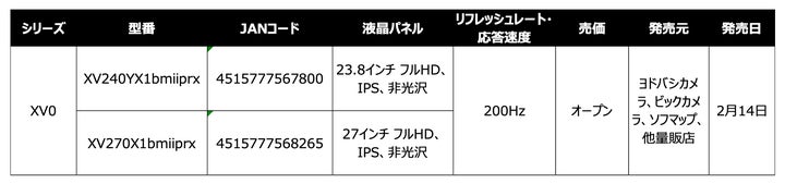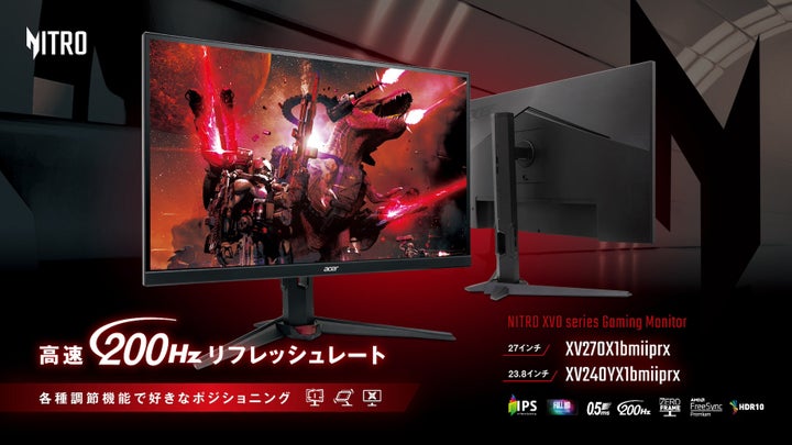 日本エイサー株式会社は、ゲーミングブランドNitroより、200Hzの高リフレッシュレートと高応答速度を誇る23.8インチ「XV240YX1bmiiprx」と27インチ「XV270X1bmiiprx」の2機種のゲーミングモニターを2月14日より発売しました。