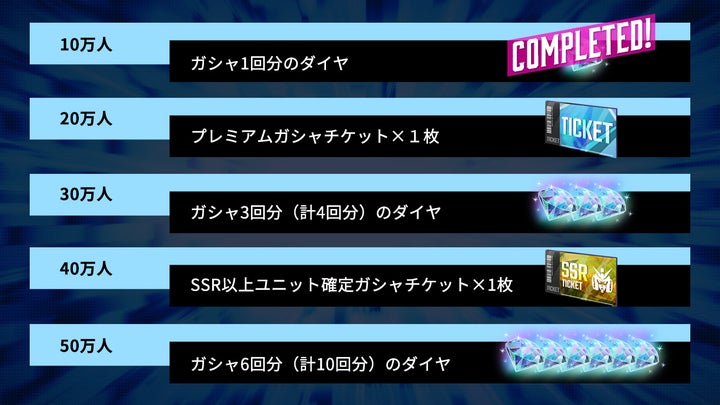 最大でガシャ10回分のダイヤやSSR以上ユニット確定ガシャチケットが獲得できます。