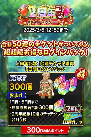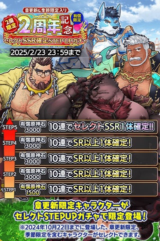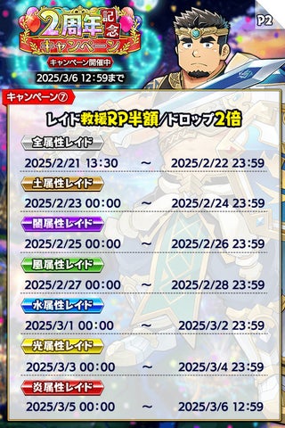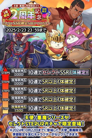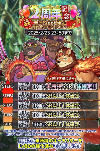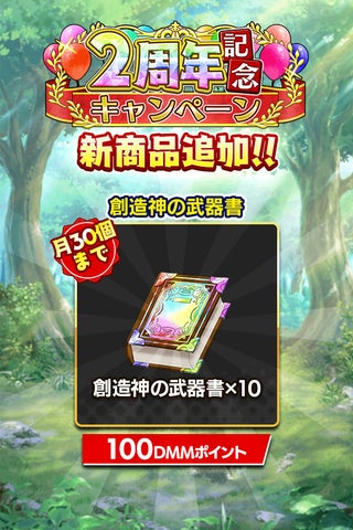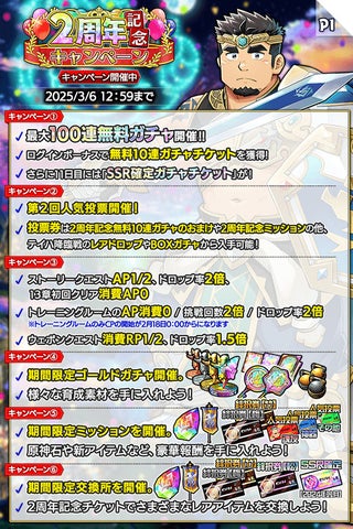 • 2周年記念キャンペーン開催:最大100連無料ガチャ、人気投票、各種クエスト促進キャンペーンなど