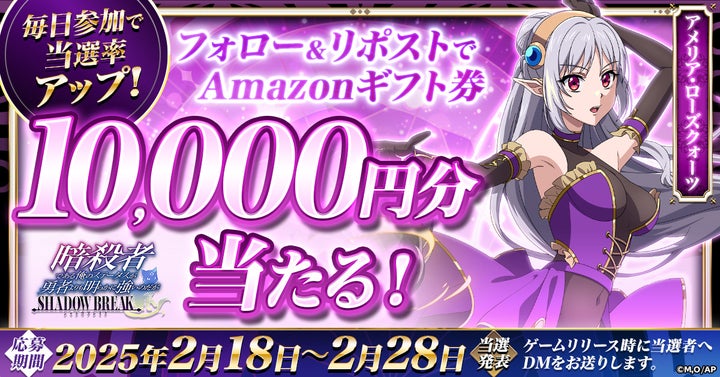 事前登録キャンペーンとして、登録者数に応じてゲーム内アイテムがプレゼントされ、公式Xでのフォロー&リポストキャンペーンではAmazonギフト券が抽選で当たります。