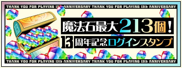 13周年記念イベントでは、「魔法石最大213個」がもらえるログインスタンプや、「13周年記念!超絶スーパーゴッドフェス」などが開催されます。
