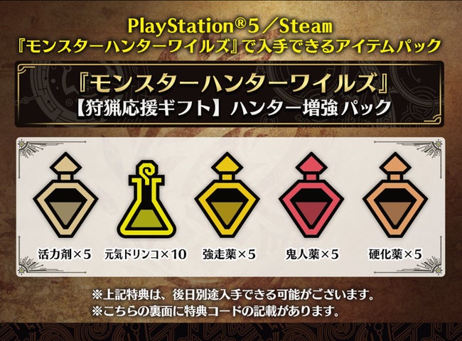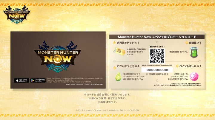 来場者特典として、『モンスターハンターワイルズ』と『モンスターハンターNow』のゲーム内アイテム、大狩猟展限定ポストカードが用意されています。