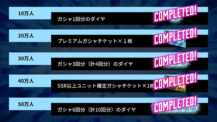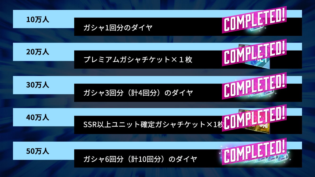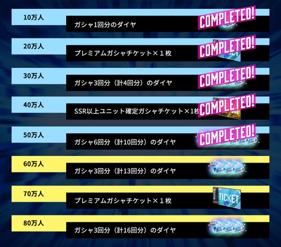 事前登録キャンペーンでは、登録者数に応じてダイヤやガシャチケットが配布され、80万人突破まで報酬が追加されている。
