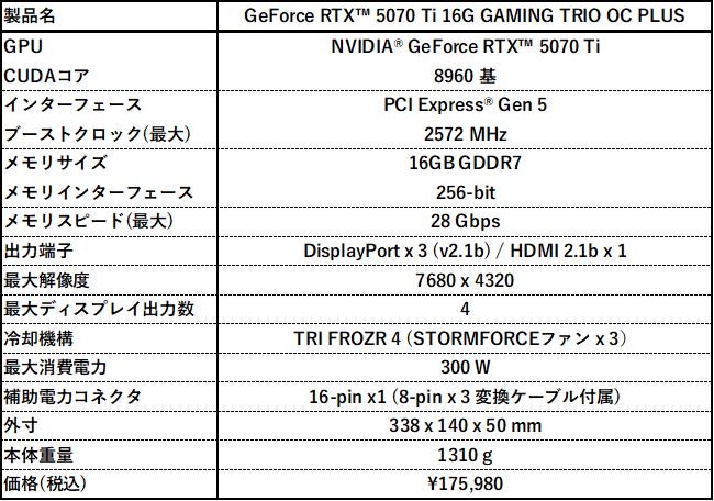 「GeForce RTX™ 5070 Ti 16G GAMING TRIO OC PLUS」は、TRI FROZR 4クーラーを搭載し、冷却性能と静音性を両立したモデルです。