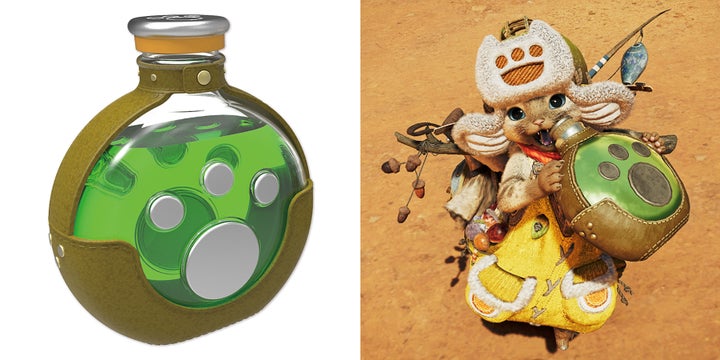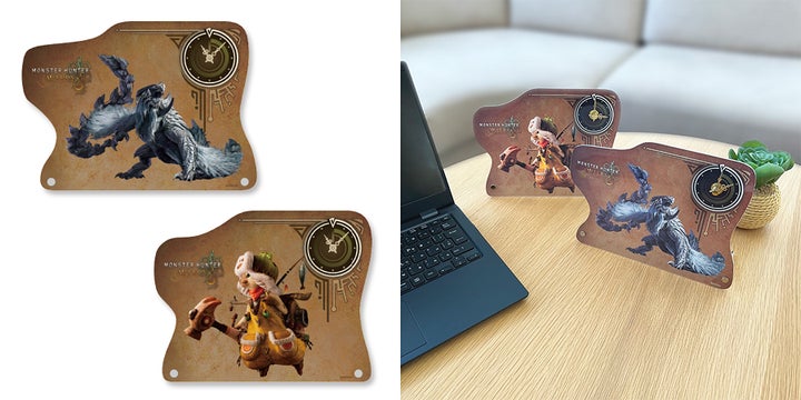 全長約40cmのオトモアイルーぬいぐるみ、ゲーム内の回復薬ボトルを模した飲料ボトル、ゲーム内の時計デザインのアクリル置き時計など、狩猟生活を楽しくするアイテムが展開されます。