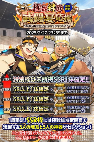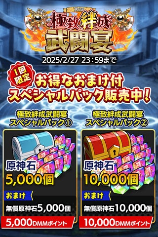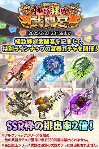 - 極致絆成武闘宴スペシャルパック、極致絆成武闘宴応援育成パック、極致絆成武闘宴百幻獣王武器ガチャ、業物シリーズガチャ、極致絆成武闘宴応援未所持SSR確定ステップアップガチャ