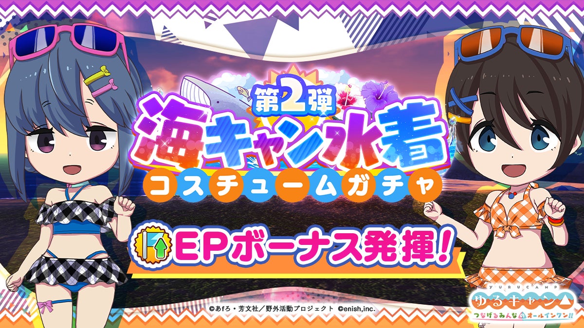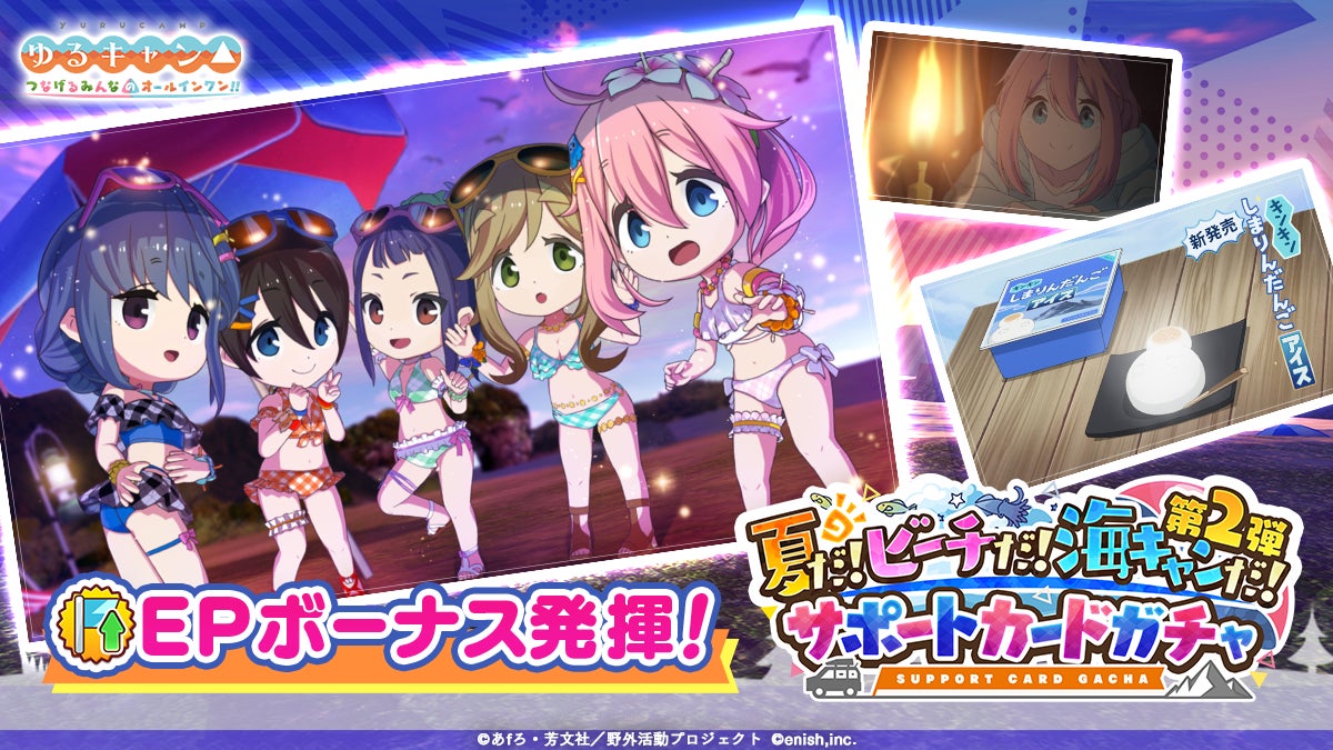 また、リンと恵那のゲームオリジナル水着が手に入る「海キャン水着コスチュームガチャ 第2弾」と、ゲームオリジナル海キャンカードが獲得できる「夏だ!ビーチだ!海キャンだ!サポートカードガチャ 第2弾」も開始されます。