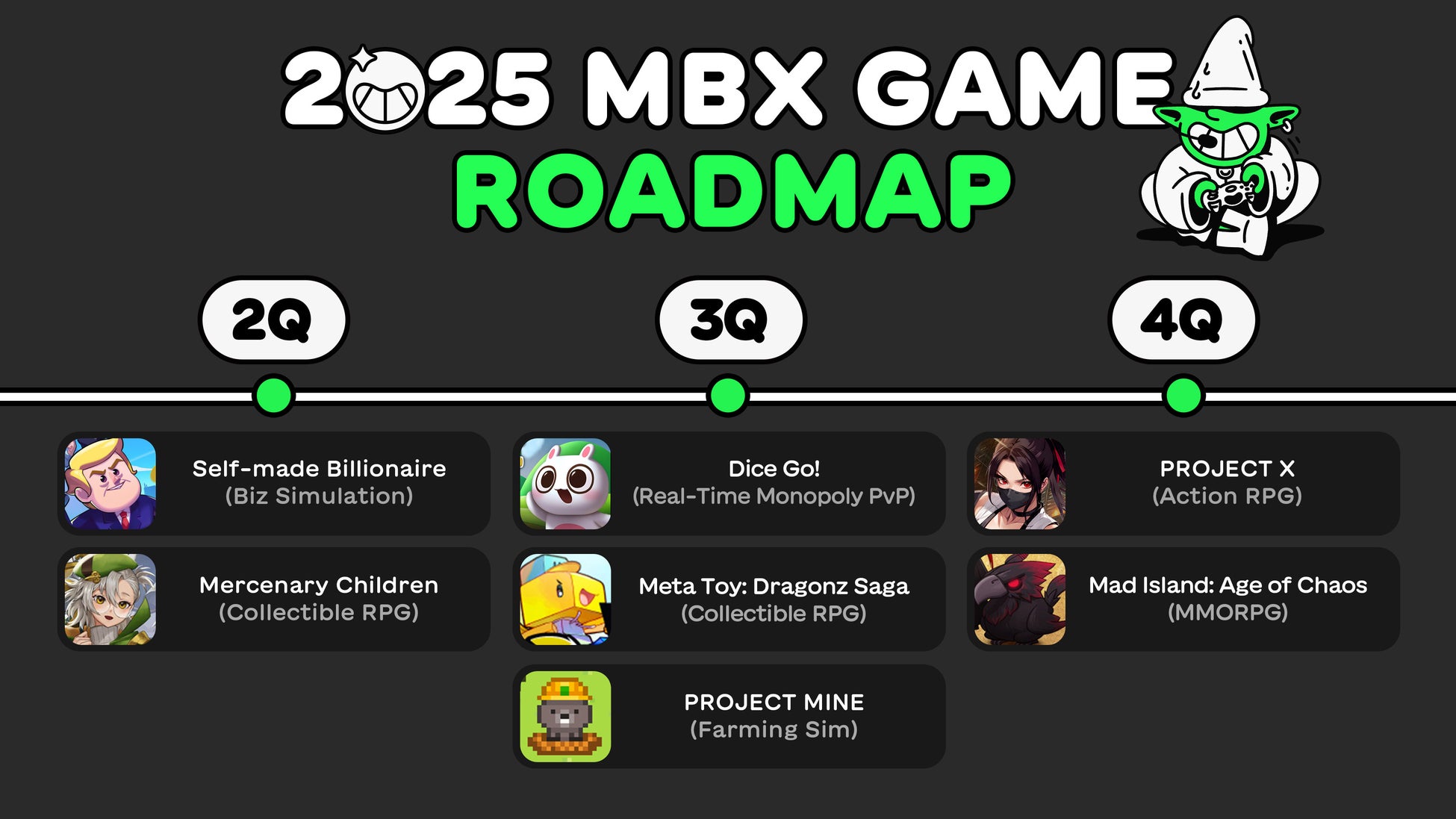 7つの新作ゲームタイトル(『Self-Made Billionaire』、『Mercenary Children』、『Dice Go!』、『Meta Toy: Dragonz Saga!』、『Project MINE』、『Project X』、『Age of Chaos: Mad Island』)も公開され、詳細は2025年第2四半期に発表予定です。