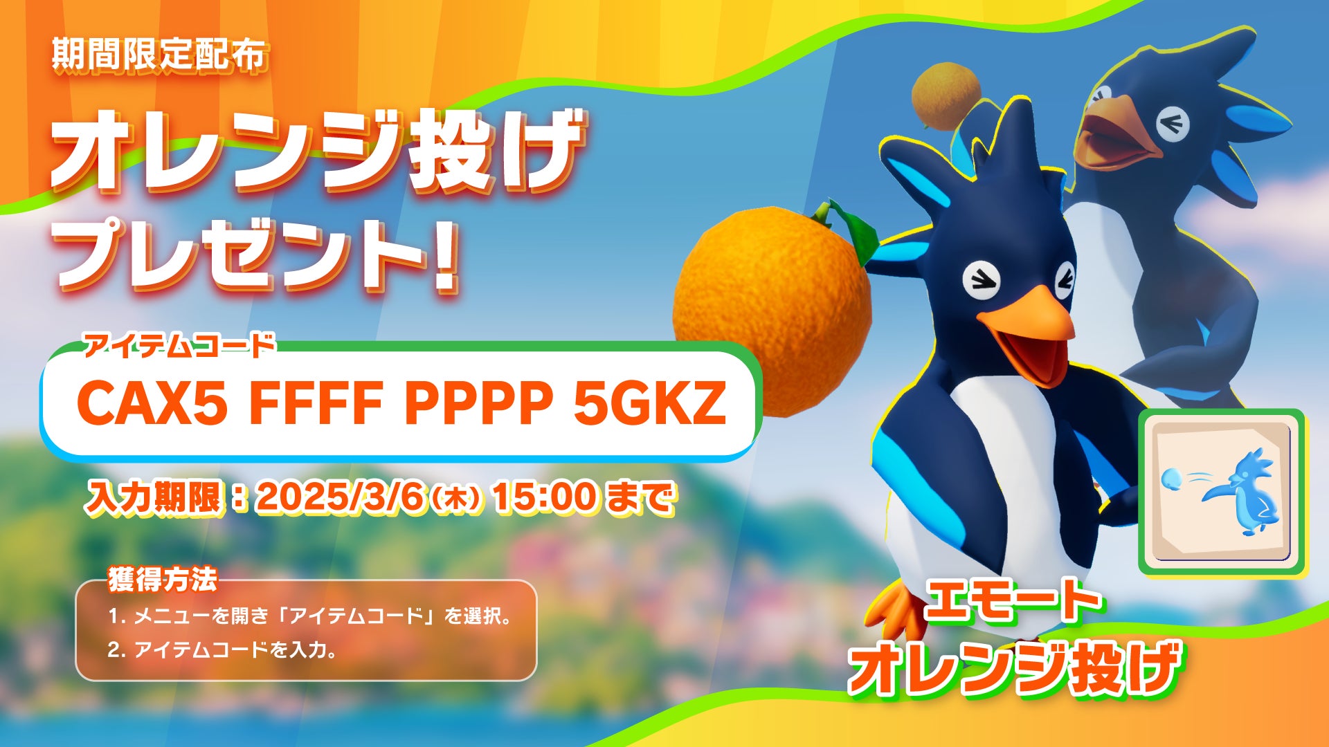 また、アイテムコードを入力することで、エモート「オレンジ投げ」や消耗品「エンジェルフェザー」を入手できます。