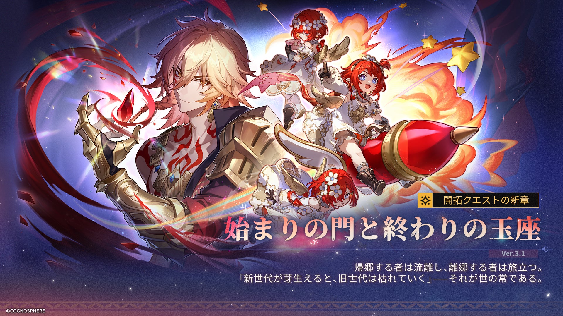 アップデートでは、開拓クエストの新章「始まりの門と終わりの玉座」、新コンテンツ「階差宇宙:千の面を持つ英雄」、イベント「ガオガオ事務所」、ログインボーナス「巡星の礼」も追加。