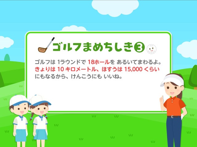 ゲームを通して、正直さ、責任感など6つの価値観を学ぶことができ、ゴルフのルールやマナーも習得できます。