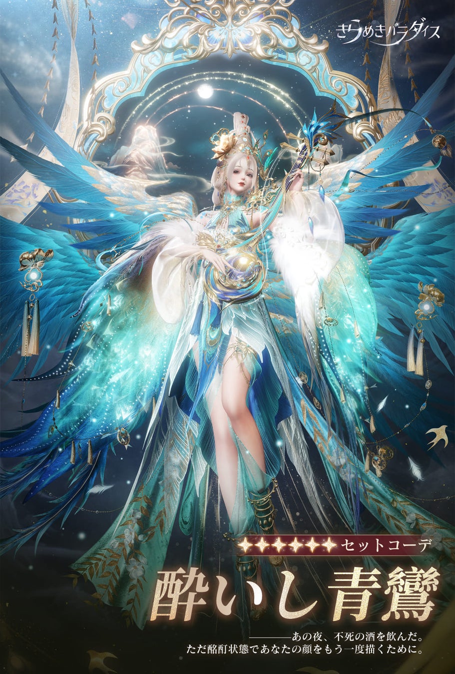 星6セット「酔いし青鸞」は中国の伝統神話「青鸞」をテーマにした豪華な衣装で、昼夜で変化する鏡のエフェクトが特徴です。