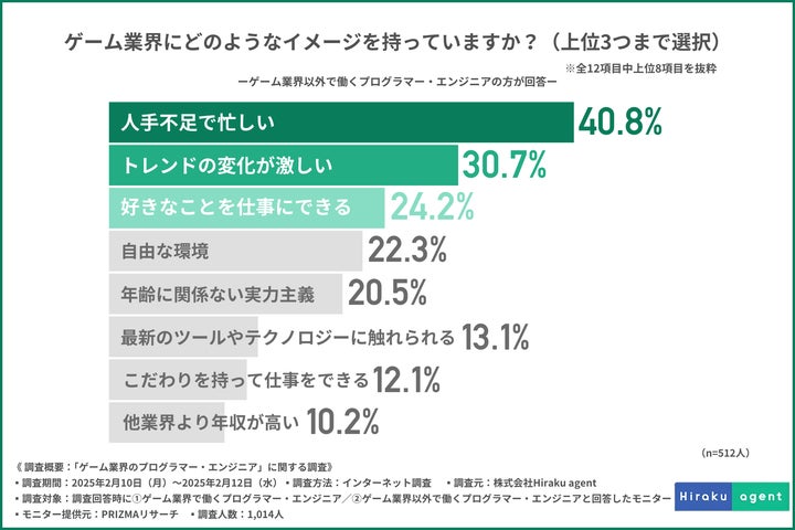 一方、業界外のプログラマー・エンジニアは、ゲーム業界を「人手不足で忙しい」「トレンドの変化が激しい」と認識しつつも、「好きなことを仕事にできる」「給与が良い」といった魅力も感じていることがわかりました。