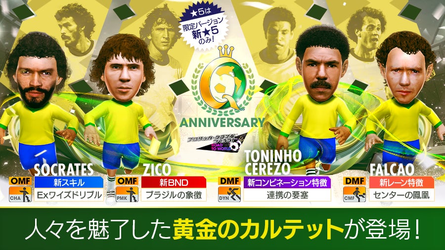 2023年7月12日から、セガのスマートフォン向けサッカーゲーム『プロサッカークラブをつくろう! ロード・トゥ・ワールド』が、ブラジルのスーパースターたちを新たな★5選手として追加する“Q Anniversary LEGEND SCOUT”を開催します。