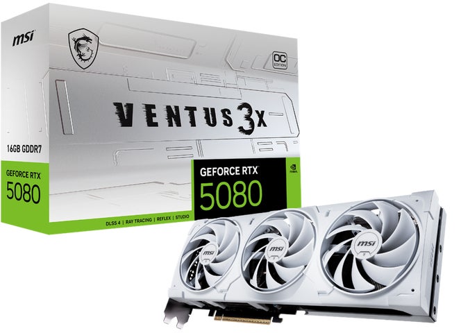 ミドルレンジモデル「GeForce RTX™ 5080 16G VENTUS 3X OC WHITE」は、ホワイトカラーでRGB LED非搭載のシンプルなデザイン。