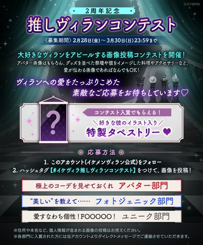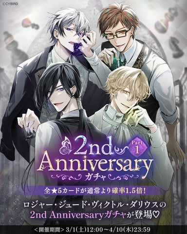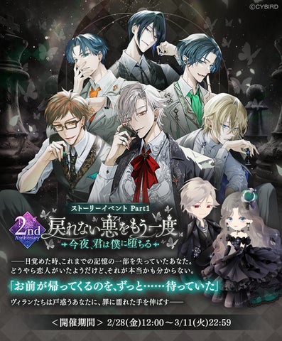 アプリ内では、12人のヴィランが登場する2周年記念イベント「戻れない悪(アイ)をもう一度~今夜、君は僕に堕ちる~」や、夏目レモン先生描き下ろしの2周年記念カードガチャを開催。