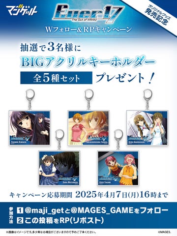 また、X(旧Twitter)にてWフォロー&リポストキャンペーンも開催中で、「Ever 17 BIGアクリルキーホルダー5種セット」が抽選で3名に当たります。