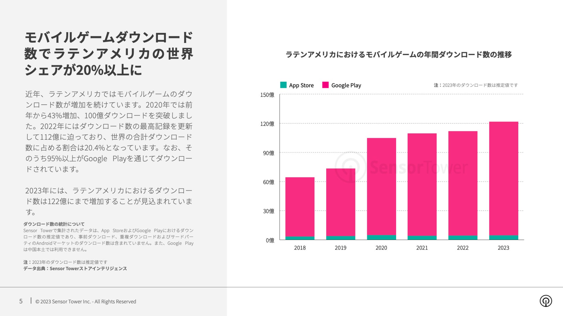 2022年には世界シェアの20.4%を占める112億ダウンロードに迫り、2023年には122億ダウンロードに達する見込みです。