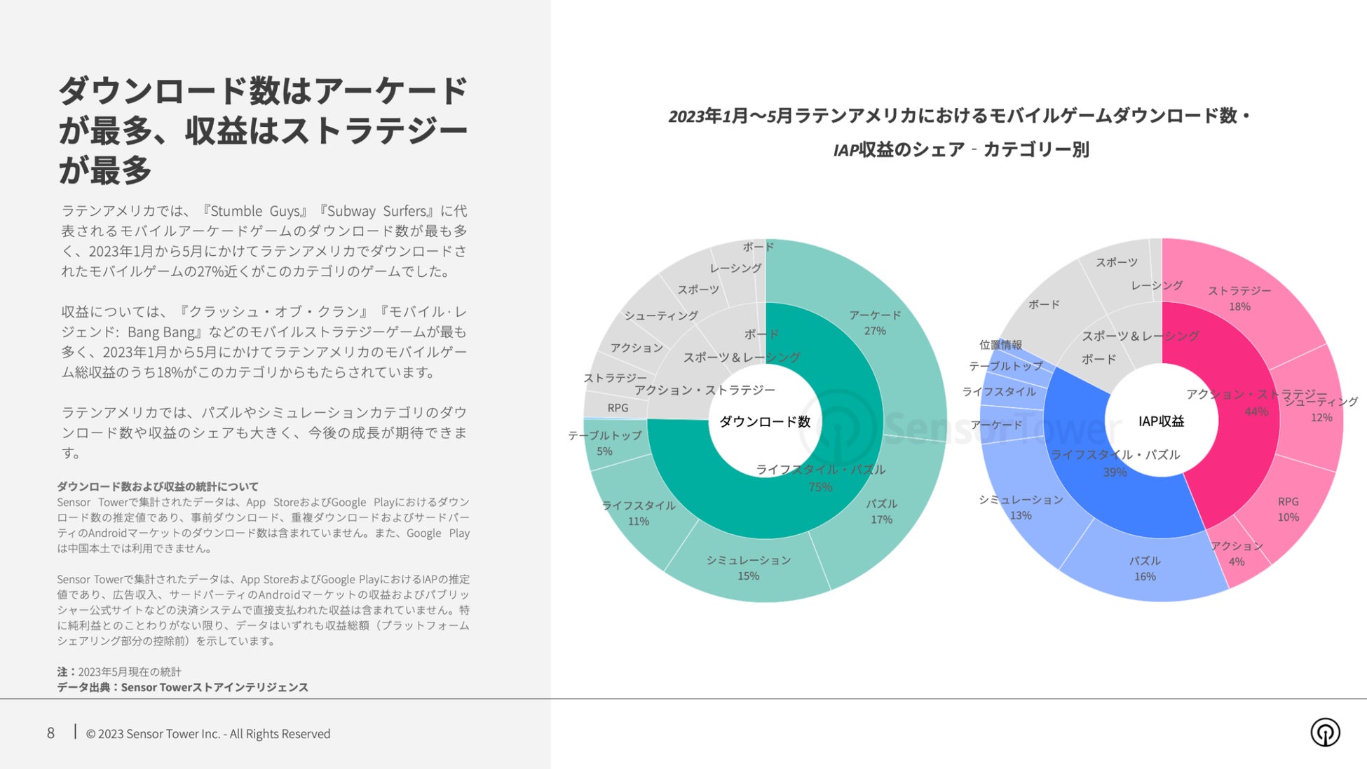 人気のカテゴリでは、モバイルアーケードゲームのダウンロード数が最も多く、モバイルストラテジーゲームが収益最多となっています。