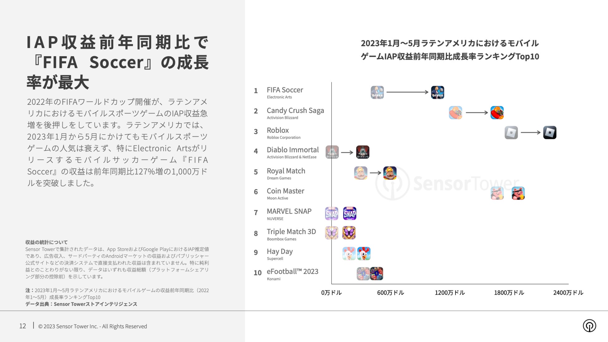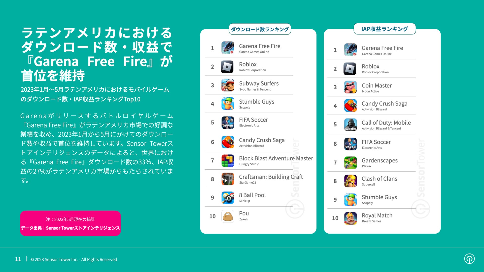 - 2023年、112億ダウンロード、122億ダウンロード、IAP収益、12億ドル、13億ドル、FIFAワールドカップ、Garena Free Fire、FIFA Soccer