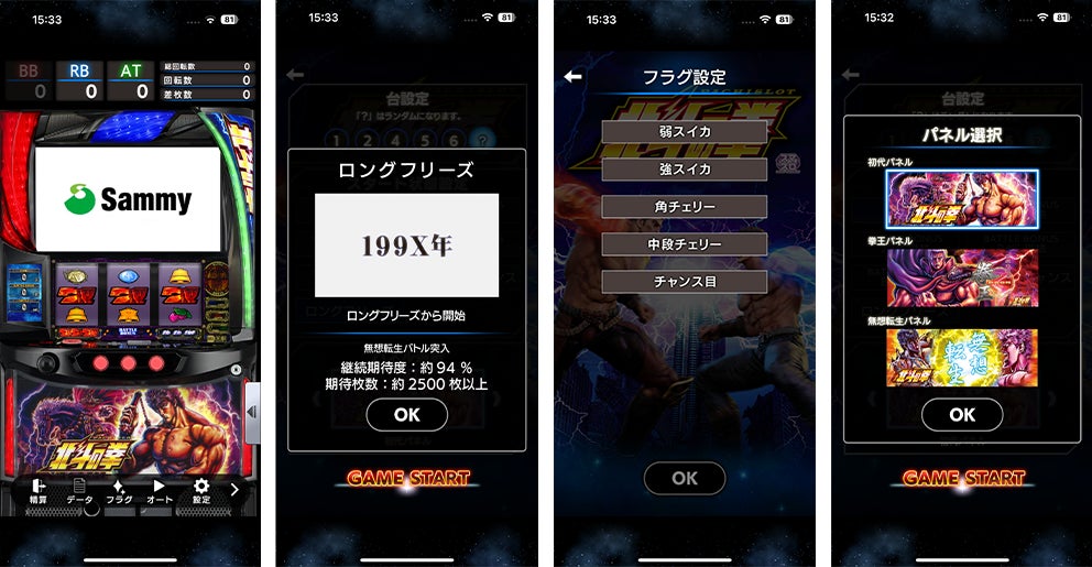 本アプリでは、設定変更や特定演出からのスタート、プレイ中のフラグ発動、パネル変更など、パチスロ機『スマスロ北斗の拳』の醍醐味をスマートフォンで楽しめます。