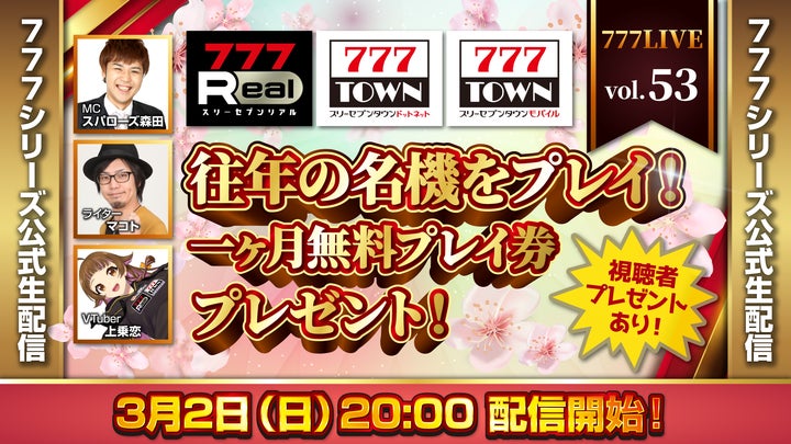 株式会社サミーネットワークスは、2025年3月2日(日)20時から「777LIVE Vol.53」を生配信します。