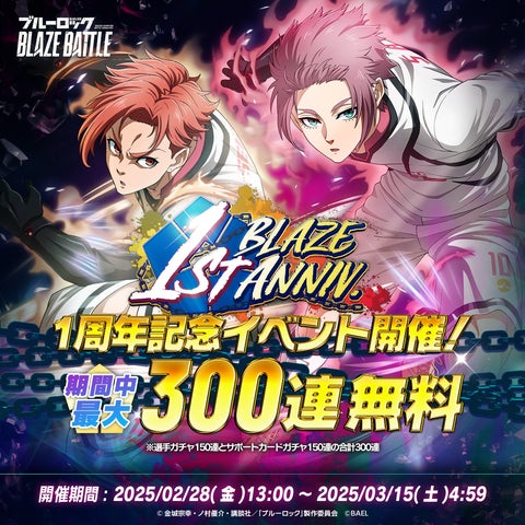 スマホゲーム『ブルーロック BLAZE BATTLE』(ブレバト)がリリース1周年を迎え、2025年2月28日より1周年記念キャンペーンが開催されます。