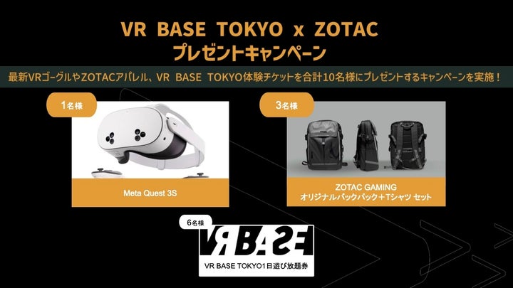 2月28日17:00~3月7日23:59の期間中、VR BASE TOKYOのXアカウントをフォローし、対象投稿をリポストすると、Meta Quest 3S(128G)やZOTAC GAMINGオリジナルグッズなどが抽選で10名に当たります。