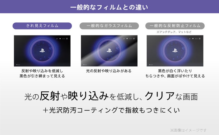 このフィルムは、画面の反射と映り込みを低減し、黒色が引き締まって見えるのが特徴です。