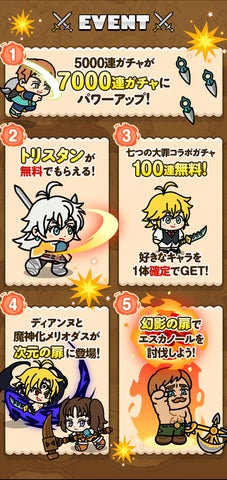 メリオダス、ディアンヌ、キング、エスカノール、トリスタンなどの人気キャラクターがゲーム内に登場し、ログインでトリスタンをプレゼント、7000連無料ガチャ、コラボLINEスタンプ配信など様々なキャンペーンを実施します。