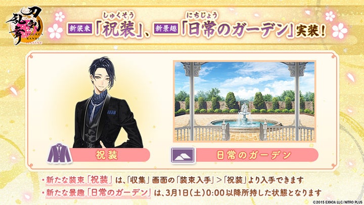また、刀剣男士の新たな近侍装束「祝装」と景趣「日常のガーデン」が実装され、「鬼丸国綱(cv.森川智之)」の極の姿も登場しました。