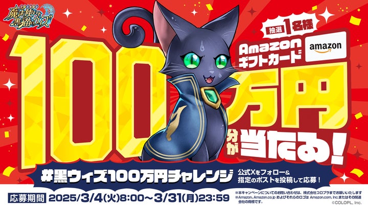 コロプラは、スマホ向けクイズRPG『クイズRPG 魔法使いと黒猫のウィズ』の12周年を記念し、X(旧Twitter)で100万円分のAmazonギフトカードが当たるキャンペーンを開催します。