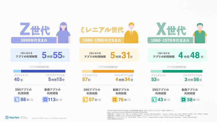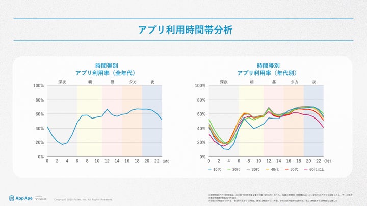時間帯別では、朝と夕方から夜にかけて利用率が高く、年代別ではZ世代のアプリ利用時間が最も長い(5時間55分)ことが明らかになった。