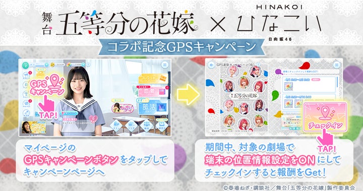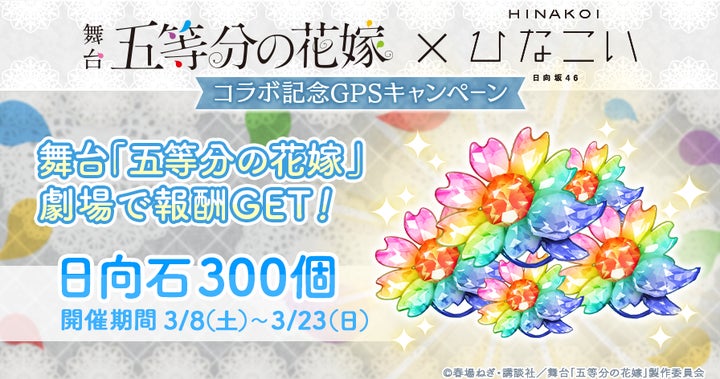 日向坂46四期生が出演する舞台「五等分の花嫁」の公演会場である品川プリンスホテルステラボールでチェックインすると、ゲーム内通貨「日向石」300個がもらえるGPSキャンペーンが3月8日~23日まで実施されます。