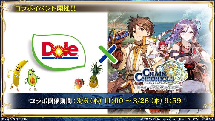 スマホ向けマルチ・チェインシナリオRPG『チェインクロニクル』で、2025年3月6日より「未来への導標フェス」と「Dole×チェインクロニクル」コラボイベントが開催されます。