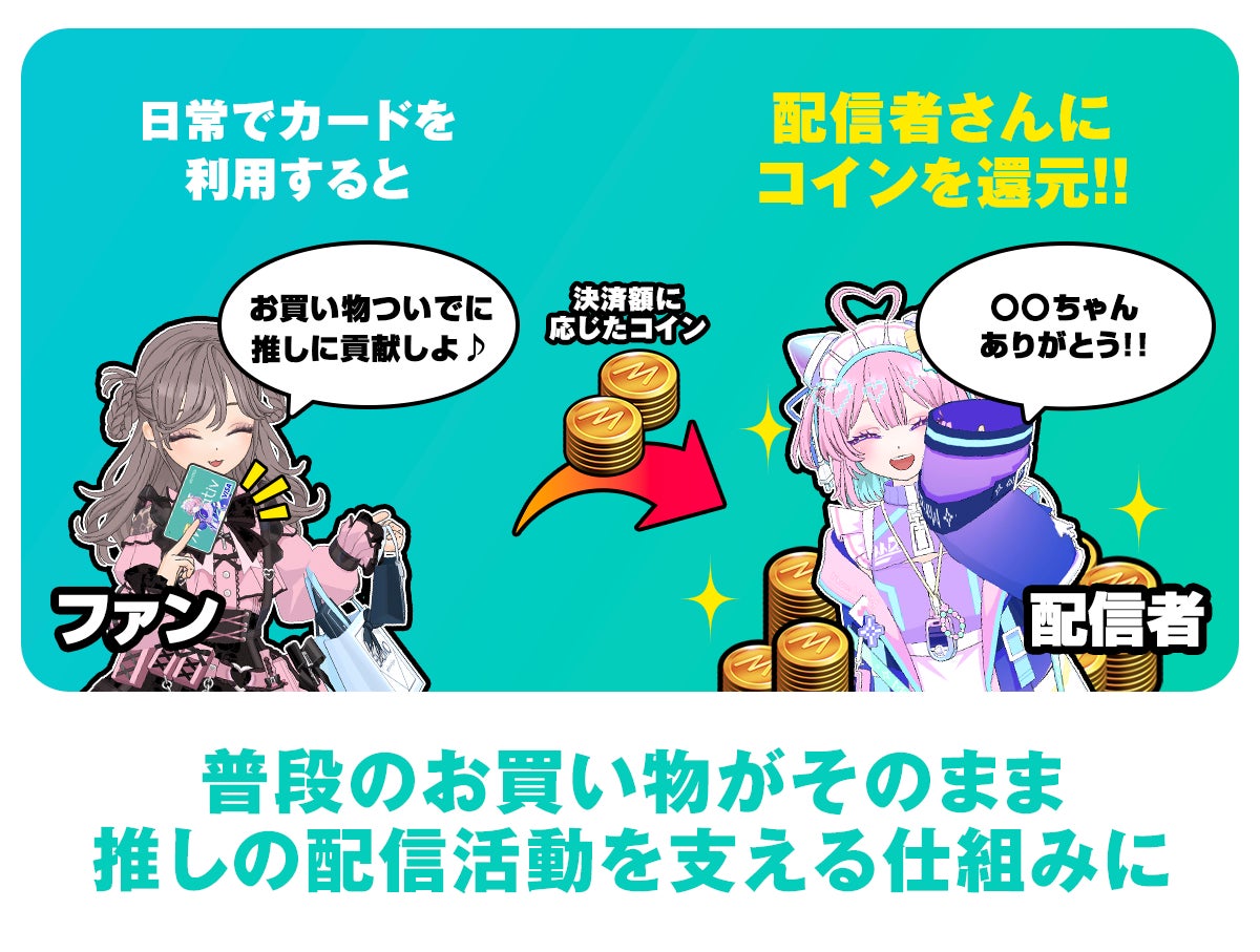 このカードは、利用金額に応じて配信者にコインが還元され、日々の買い物が配信者の応援につながる仕組みです。