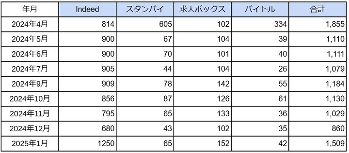 Indeed、スタンバイ、求人ボックス、バイトルといった主要求人サイトからのデータを集計した結果です。